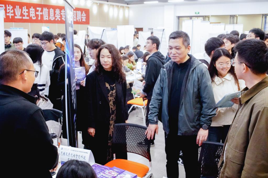 公司党委书记张华、党委副书记吴妍,人工智能与计算机公司党委副书记王莉莉、集成电路公司党委副书记糜海燕等深入招聘会现场,与多家企业代表进行了深入交流,详细询问了今年的招聘计划、岗位需求以及对学校人才培养的反馈建议,并对各用人单位长期以来对学校就业工作的支持表示衷心感谢。随后,他们与正在积极求职的毕业生们亲切交谈,了解他们的求职进展与职业规划,并鼓励大家树立信心,把握机遇,争取找到理想的工作岗位。