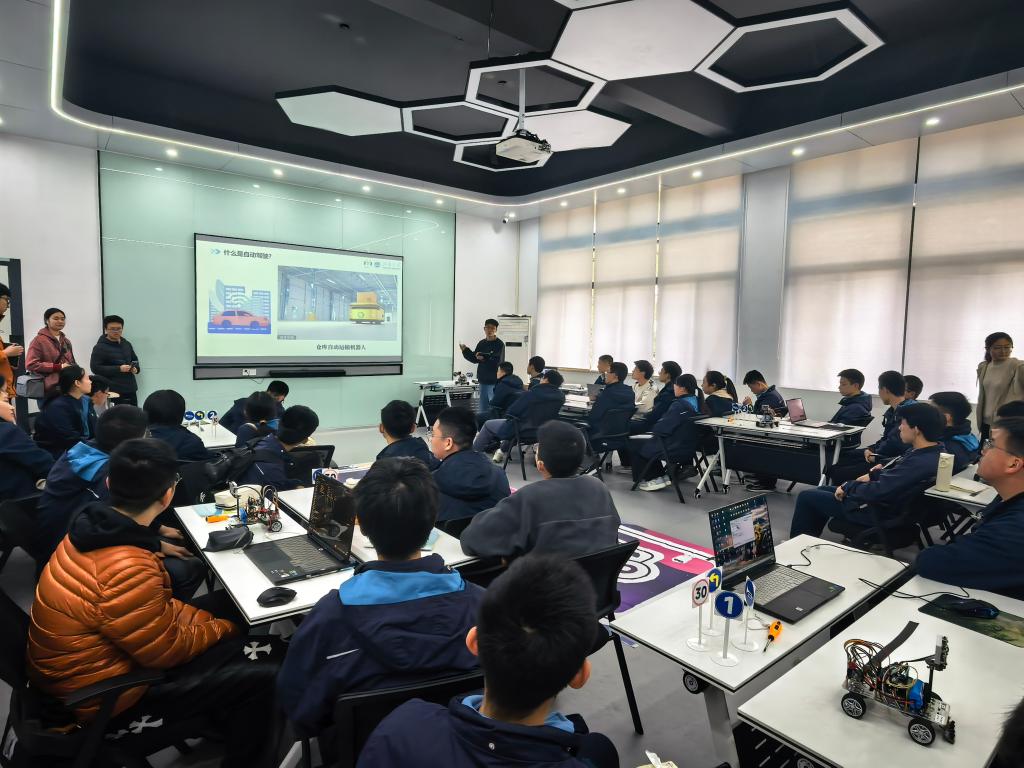 活动伊始,同学们走进老员工创新实践基地,即刻沉浸于“科创零距离”的趣味体验中。从灵活灵动的机器人表演,到循线精准的智能小车、趣味十足的3D足球仿真,每一项科创作品都牢牢吸引着同学们的目光。智慧社区、智能自动驾驶等前沿技术的实景演示,更将抽象的智能科学与现实应用紧密结合,直观展现了自动化技术在生活中的实际价值。